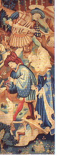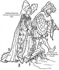 | Man and woman, drawn from the Devonshire Hunting Tapestries, 1420. Note how full the hem of the man's garment is, and how his belt hovers around his hips. Magically. Note the V neck in front, edged with fur like the hem. Here's a picture of the orginal tapestry section, showing three people with one decorated sleeve. (Unless the guy in the background has a decorated hood; I can't tell.) | ![]() |