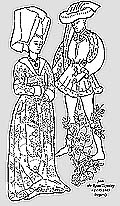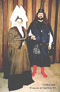 | Both of us at a recent event 3/00. My houp is not of this plan; the butterfly hat finally makes me taller than him!. To get the "no shoe" effect from the medieval pictures, we dyed white canvas slippers to match his hosen. | ![]() |
