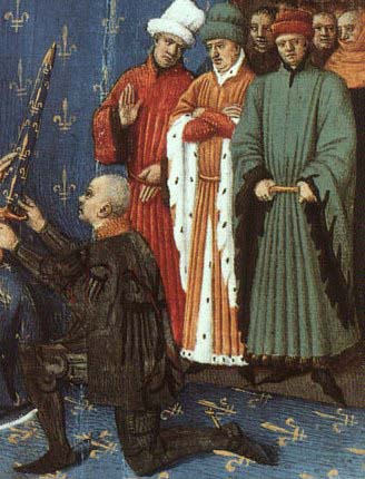 One of these days I'm going to sit down with all my pictures of patterned houppelandes and see if the patterns in the fabric themselves give any hints as to the orientation of the pattern pieces on the fabric yardage. This might help with construction questions, IF the painters were painting from real examples, and replicated the patterns as they were, not just as artistic license.