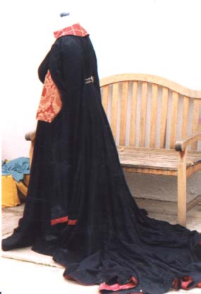 Because the fabric that I did the first version in was cheap and not very thick (the black with red), the train tends to fold over itself as it is worn around, but my friends had a lot of fun pulling it out and arranging it to drape nicely. It was a draft dress, after all. It's black; the collar and sleeve linings are a red/gold lattice pattern, and there is a red band at the hem of the sleeves and the skirt, to imitate a full red lining.