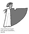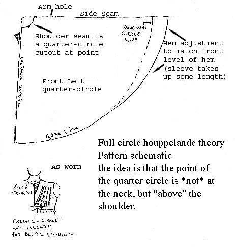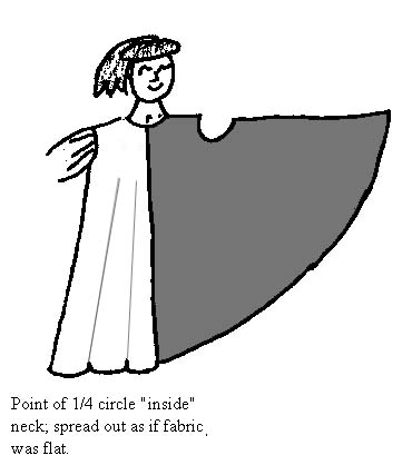 | Now consider a full-circle houppelande with the center of the circle at the neck. (But with that same curve cut out, like for a circle skirt.) The folds will either head toward the neck, or they won't really be there at all, because the fabric has not been pulled up to create the stress lines that are reflected in what we see as folds. This version does produce a lot of fullness at the hem (good) but doesn't explain the V-necks we see in most pictures (bad.) | (Not CV's) |