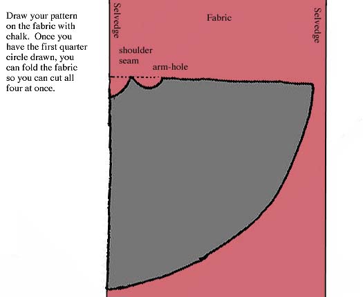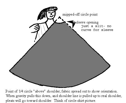 simple, once you understand the method. What really helps: Do it for a doll first! Graph your needed measurments (primary one being the radius, which is equal to your shoulder-to-hem desired length, plus whatever hem you want) onto your fabric with a piece of dressmaker's chalk. As noted here, the CF and CB seams are on the selvedge. This allows for a train, and for extra distance going over busts or tummies. If you need more room sideways, join fabric together parallel to the selvedge. If you're not certain, cut it out of cheap fabric first and check the drape and hem. Once you're satisfied, you can cut all four out at once. Then you just need the triangle inserts (next diagram) for the front and back, and your sleeves. If you want a train (and some of the women's did have longer back sections,) be sure to graph that out before cutting! When it's put together, belt it in, arrange your pleats and have someone mark the true hem for you. NOTE: I've had some problems with little pointy bits at the outside of the shoulder. This is solved by having only a slit for the hole for the sleeve, instead of a curved bite as shown in the tiny diagrams -- I've corrected the large ones that these link to. More images will be coming soon. |