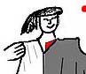 | Diagram of the triangular sections that are inserted along the center front and center back, to bring the neckline up to "crew neck" level. NOTE that these should probably be larger than the one pictured here. The triangle in front on my newest houp seemed to be more graceful if it was about a foot tall from neck to mid-chest, and in back, about 9". See the pictures of the blue man's houp for proportion. | ![]() |