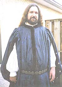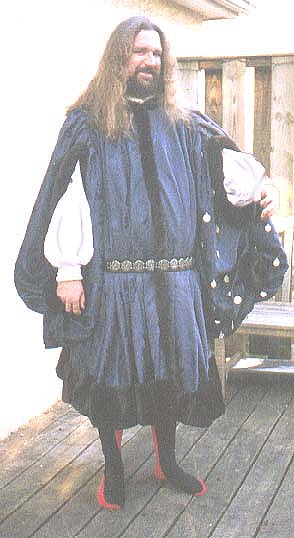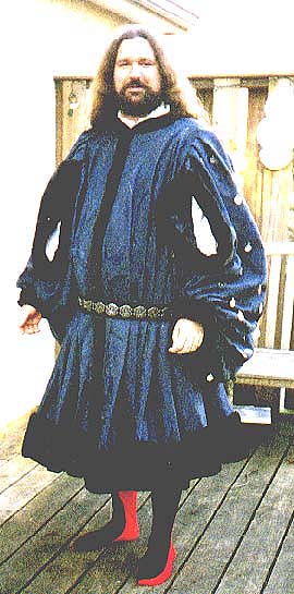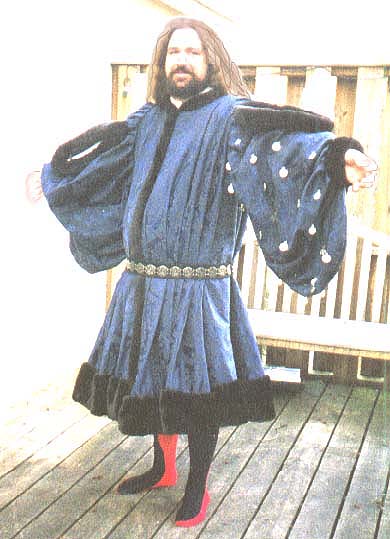 | Houp for my husband, Lord Francois Thibault. Wrist openings and slit sleeve. Blue cotton damask, edged with brown false fur (like the sort that Gund uses; very pettable.) Silver colored mounts on one sleeve only; belt loops to hold up belt magically at hips. Hook tape to fasten center front. Hem is about 9 yards; the whole garment used 10 yards of 54" fabric. It weighs about 10 pounds, but as all the weight is spread across the shoulders, he reports that it is very comfy. These are not the normal hose. |