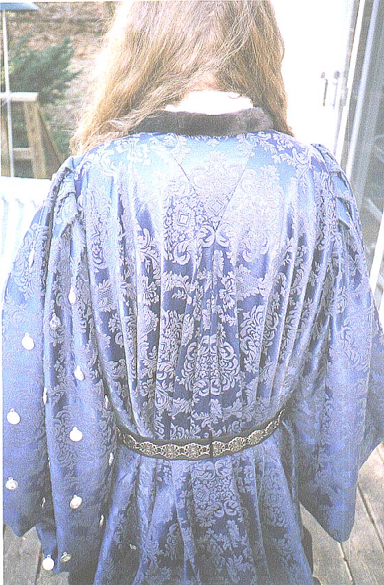 For the man's, I used a cotton damask with about as much body as chino slacks. The brown fur trim was a fancy fake fur; the bezants were obtained from The Pillaged Village, and were intended for middle-eastern bellydance outfits. They look much like the various mounts dug up from England.
