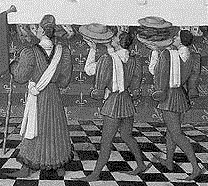 | Servers of high rank. Note the V neck in back, with the pourpoint collar showing above it. | ![]() |