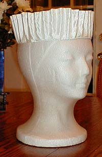 Now all you need is a band for holding it on. Measure around your head as if you were wearing a kerchief, making sure to go over the top of your head, rather than around your face. Cut your fabric this long, plus 3" and as wide as you like -- I suggest 3" wide, which you then sew into a tube, and turn inside out and press.