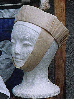 Most folks call this arrangement a barbette (strap) and fillet (hat). I'll use those terms.