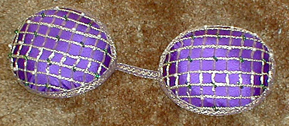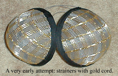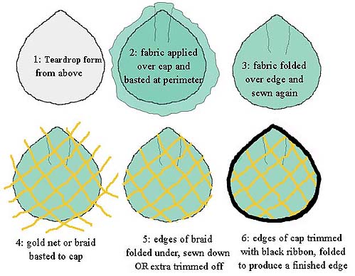 Now, apply the gold netting. If it is ribbon-style, apply the first strip along the center of the form, and tack it down by sewing. Lay the next strip so that it appears to be a continuation of the structure of the first one. Baste that down. Use this process until the whole cap is covered. Tack the edges of the netting down about 1/4 inch from the edge of the cap, so the ends don't frizz up when you trim them to the edge of the cap, just like you did with the under-fabric.
