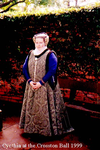 Navy and gold upholstery fabric, Wal-Mart, $2/yard. Cotton. | 1300-1400s. Picture of garb using this fabric. |