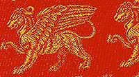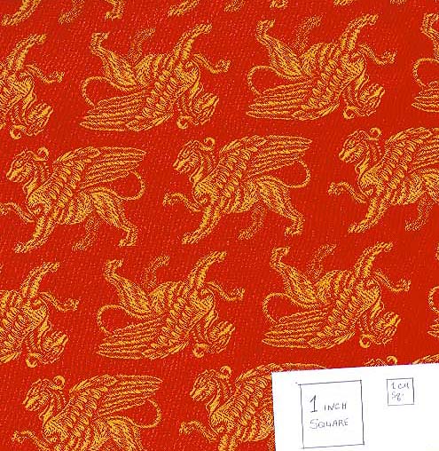 Lovely gold griffins against scarlet satin back. Eye-popping in person. Possibly Rayon; unknown original price,but Timeless Textils has it for $18/yd. | Simialr to above;
