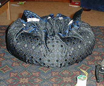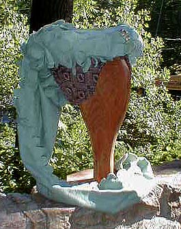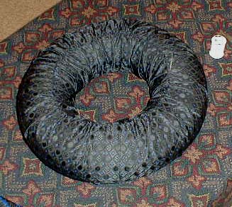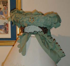 The dagged roll was my original one -- it took 21 yards of dagged fabric to wrap it. The tail is also original. This time, I didn't need the pound of buckshot that originally counterbalanced the tail. The tail of the "iguana" is conical, and is sewn to the hatform inside the stuffed roll, so that it looks as if the roll is the natural "cuff" or edge of the tail. |