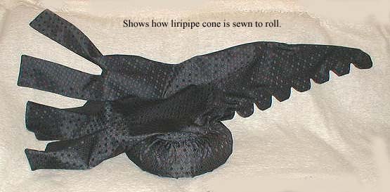 The lining for the dags stops about 6" above the top of the dags and is tacked down to the fabric at that point. The seam of the cone is open where it is sewn to the roll. |